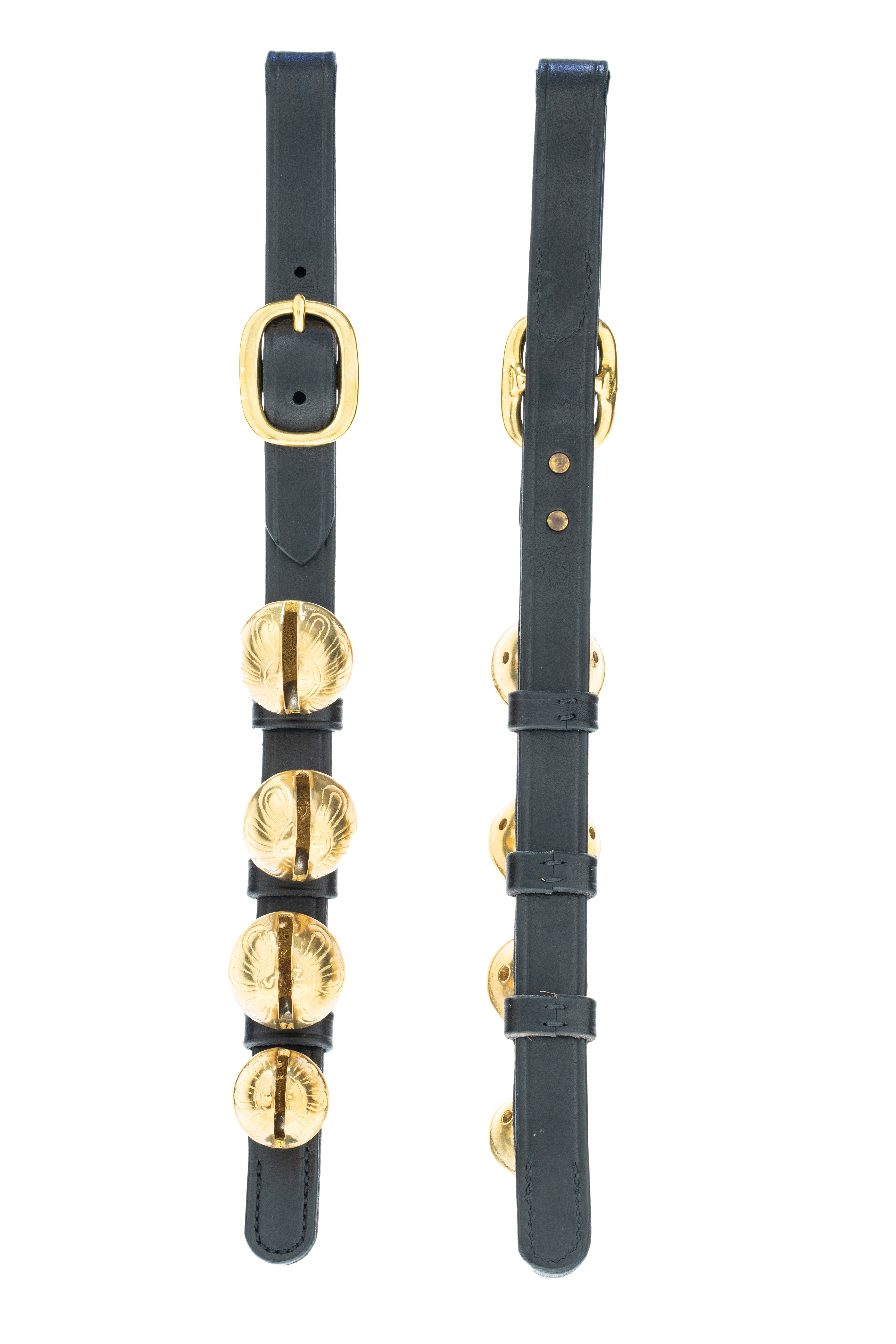 Pair Of 2 Straps Black Bridal Leather Cast Brass Belt Bells Fits Up to A 4″ Belt
