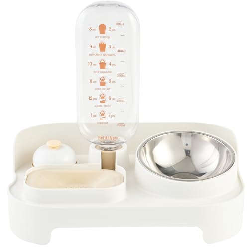 2 in 1 Pet Food and Water Dispenser, Dog & Cat Food Bowl with Automatic Pet Water Dispenser, Convenient, Leak Proof & Stable Pet Feeder with Water Filtration & Training Bell (White)