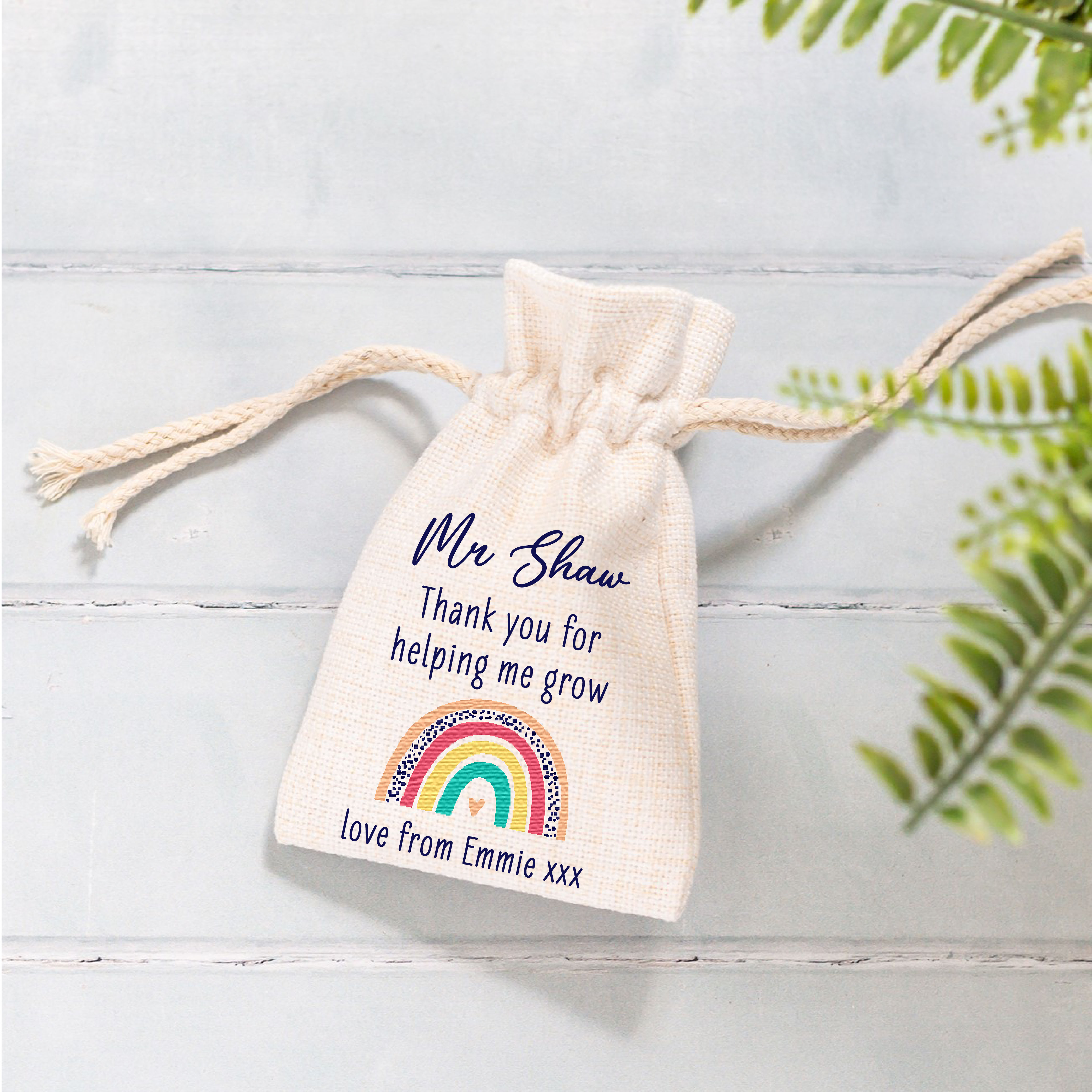 Personalised Teacher Helping Me Grow Linen Drawstring Pouch – Teacher Appreciation Gift Bag